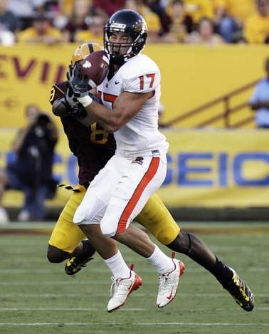 Damola Adeniji (80) makes a catch against Arizona St. Cornerback Pierre Singfield. (AP photo)