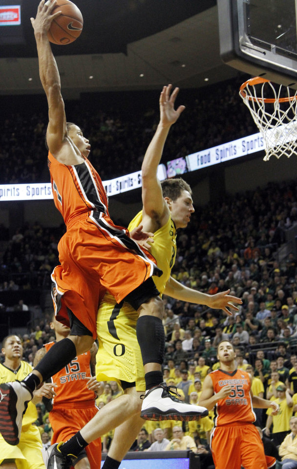 Oregon St.'s Jared Cunningham scores over Oregon's Garrett Sim.