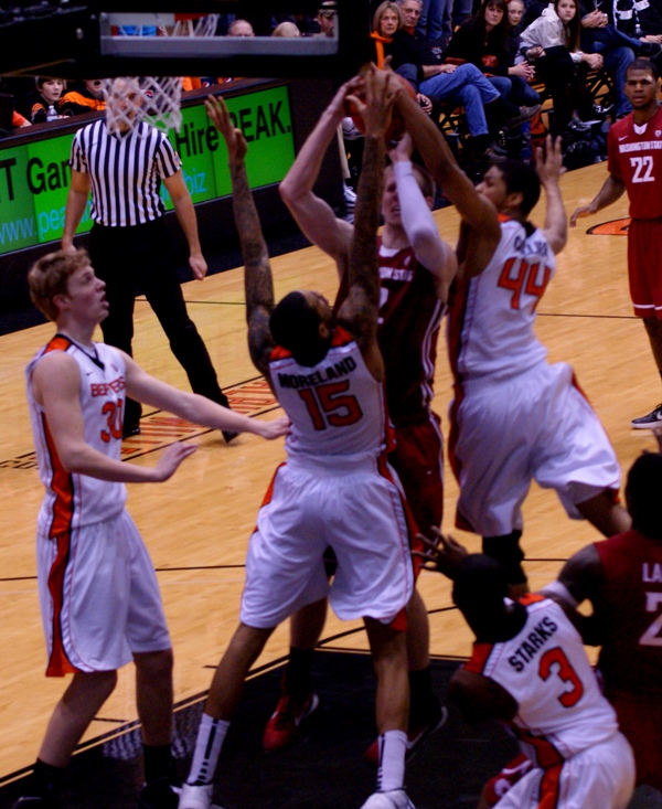 It wasn't as though all the atrocities were to the Beavers' disadvantage, though, but Washington St. coach Ken Bone's dropping and shaking his head didn't draw the attention Robinson's animated response did. (Though it looked like Bone would explode when Moreland retrieved a loose ball on the Washington St. bench with 1 foot entirely out of bounds, and the Beavers still retained possession.)