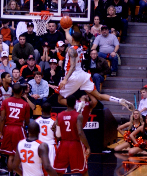 Still, the Beavers had chances to pull the game out, as Collier, above, had 11 of his 14 points in the last 7 minutes of the game, and both Nelson and Starks scored in the final half minute. But after an inbound play that took over 6 seconds to execute, Starks had to foul, and Woolridge buried both free throws for the final lead, and Starks missed a 3 pointer to tie the game, badly off line to the left.