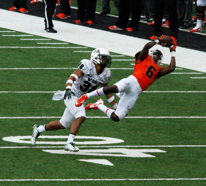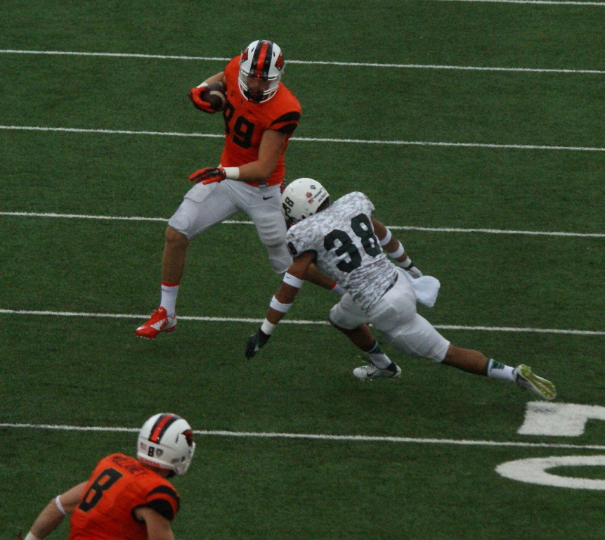 As expected, Victor Bolden, above, had a good first game as a starter, especially in the first half, and as hoped, Richard Mullaney had a good game. And the tight ends were a huge part of the Oregon St. offense, accounting for 10 of the 26 catches, and 141 of the 328 passing yards Mannion threw for, with Connor Hamlett being the game's leading receiver.