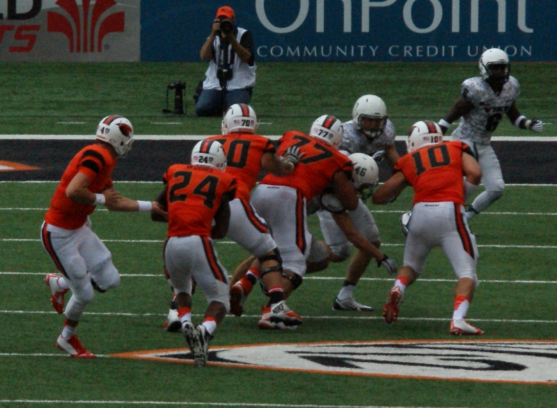 Oregon St. also accomplished pretty good balance, with only 8 more passes than runs, though 4 pass plays wound up in the books as rushes, due to various breakdowns. And as a result of that and the 5-1 edge in turnovers, the Beavers were just 34 seconds shy of having a 2-1 edge in time of possession, and the 31 extra plays translated into 10 more first downs than Portland St. posted.