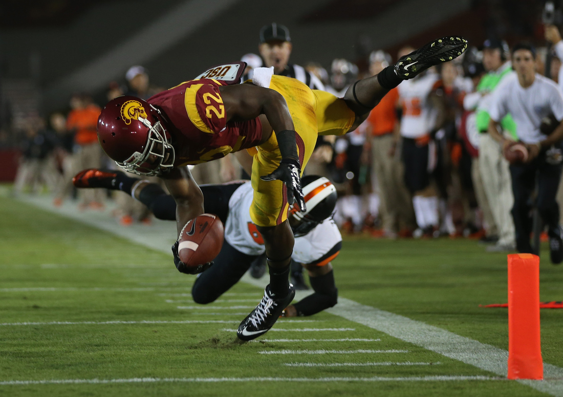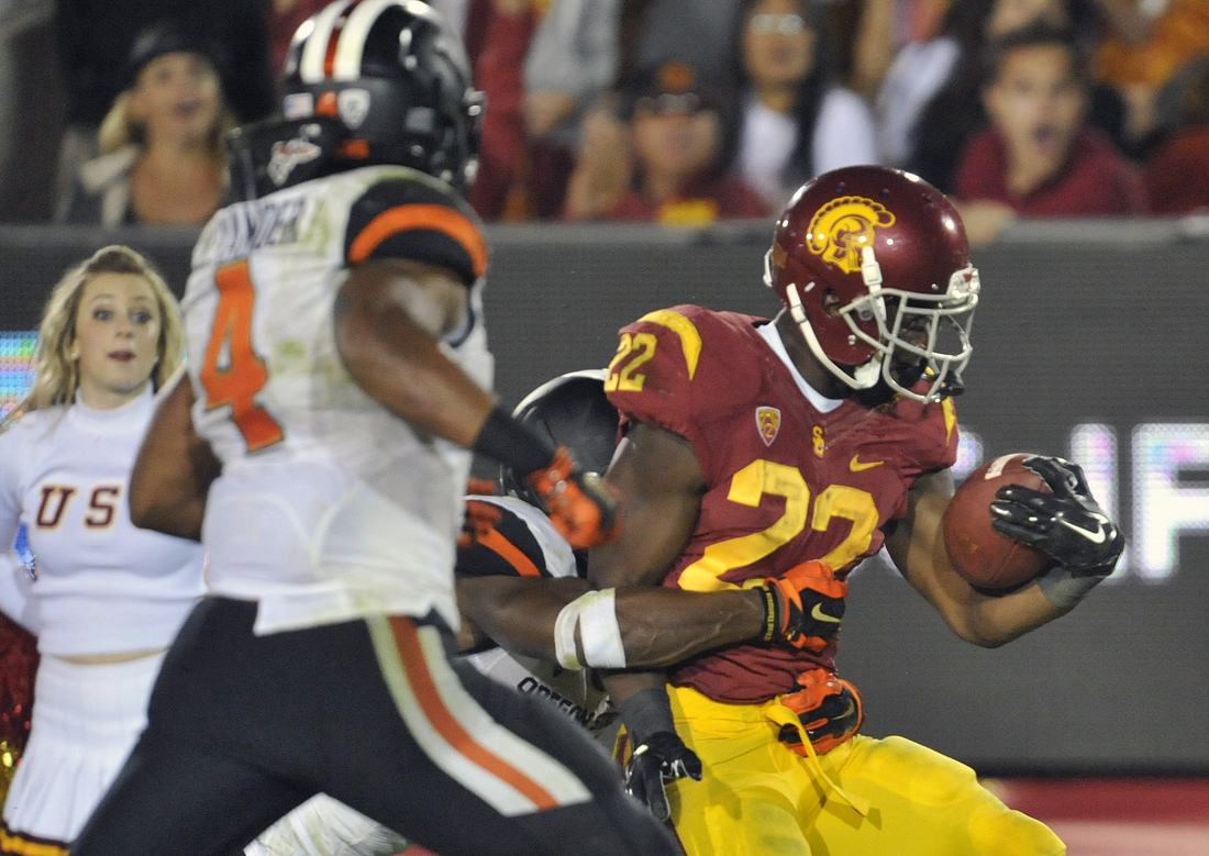 USC made a statement, 87 yard 12 play drive that crossed over from the 3rd quarter into the 4th, capped by Javorius Allen, one of the stars of last year's USC win in Corvallis, who made a 17 yard touchdown run through a tiring Oregon St. defense, above, to open a 28-10 lead.