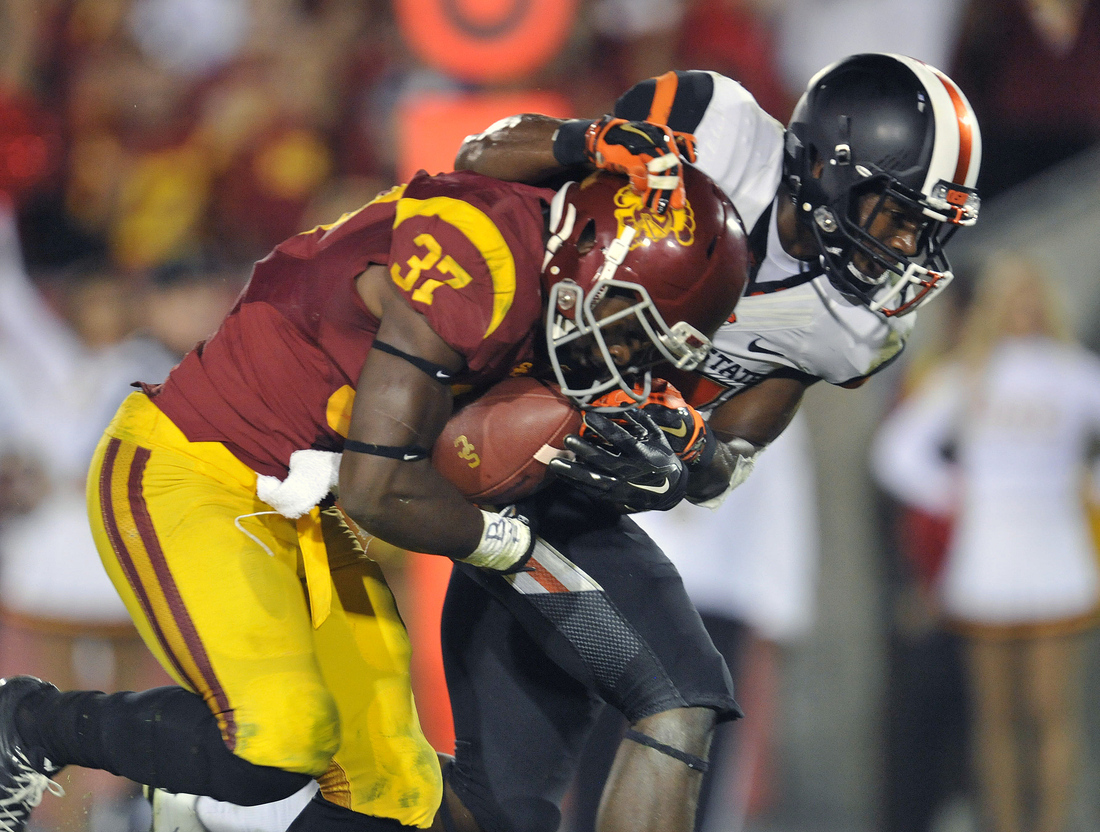 A missed tackle by Scott led directly to a 16 yard touchdown reception by Justin Davis, above, that Ty Zimmerman couldn't get to in time, that put USC ahead 14-10, and for good as it would turn out.