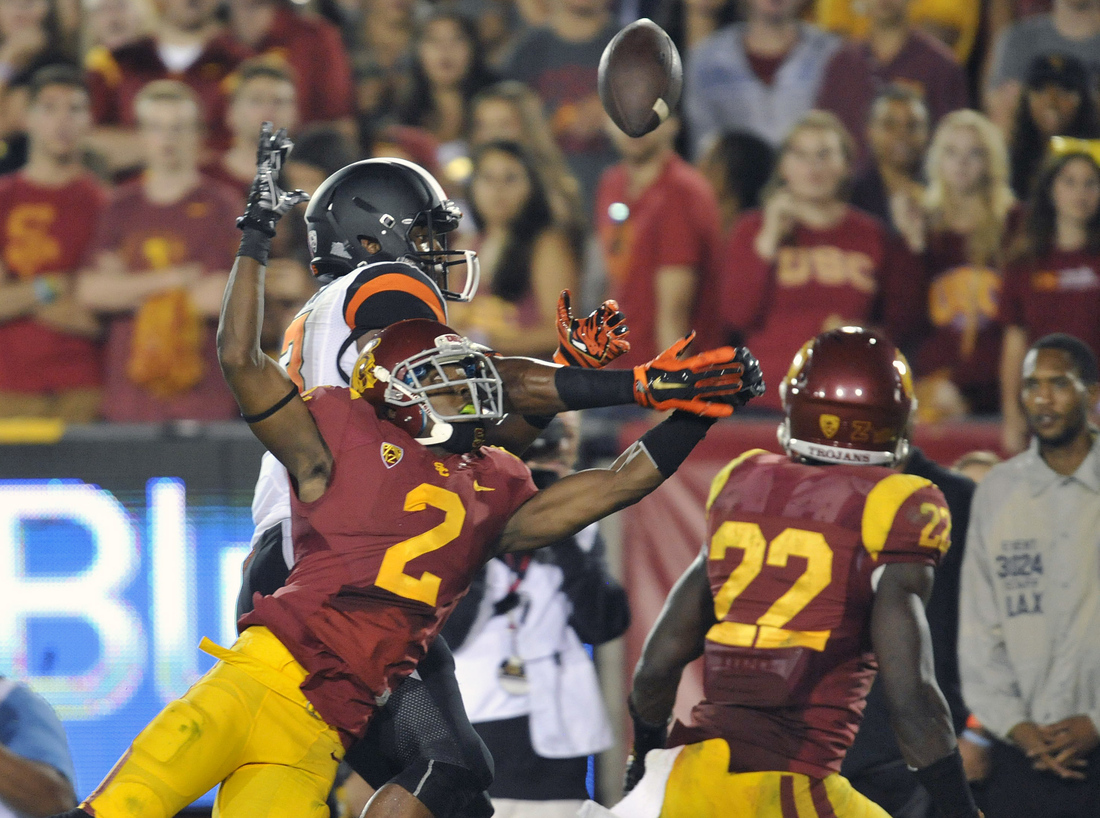 Mannion and Oregon St. would recover, but the drive came up empty when a deep route into the endzone down the left side went awry, as Jordan Villamin, making his first career start in place of Mullaney in the split end spot, tipped the ball off his hands up and forward, and into the hands of USC safety Leon McQuay for an interception, below.