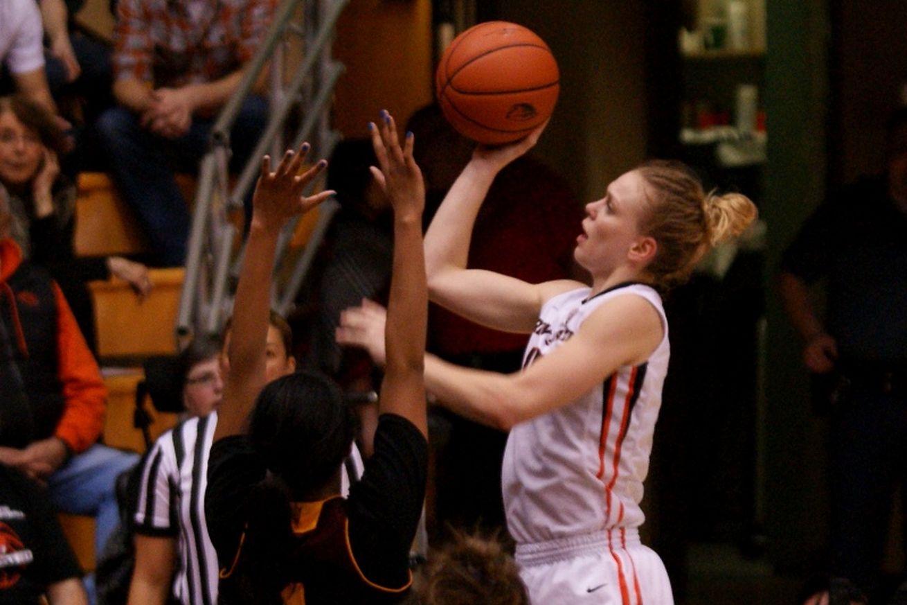 Oregon State's start to the second quarter began well as the Beavs took their first lead, 15 to 12, on a Wiese 3-point basket. The game then saw both teams exchanging blows as 3-pointers and hard fought baskets kept the score going back-and-forth. A Deven Hunter offensive rebound and put back then gave the Beavs a four point lead, which helped shift the momentum to the Orange and Black side. This momentum swing then led to a Gabriella Hanson fast break basket after a huge Hamblin blocked shot, which put the Beavers up 25 to 19 with 5:34 left in the half.