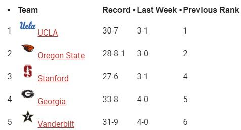 - D1 Baseball released their weekly Monday morning top 25 and the Pac-12 is well represented. As expected, UCLA and Oregon State occupied the top-2 spots and Stanford jumped up to third in the rankings. Arizona State checks in at #15.