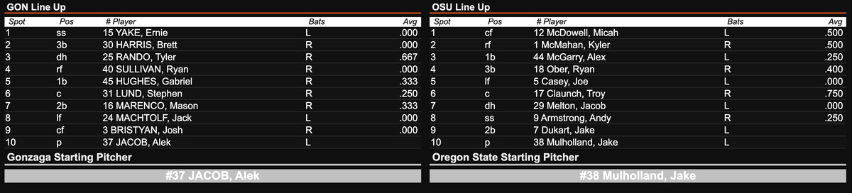 The Beavs started the regular season off with a bang yesterday thanks to an 11-4 victory against New Mexico down in Surprise. Any doubts about OSU’s offensive ability seem to have been quieted, for the time being. Today, they try to improve to 2-0 against a Gonzaga team that dropped their opener to BYU yesterday 1-7.