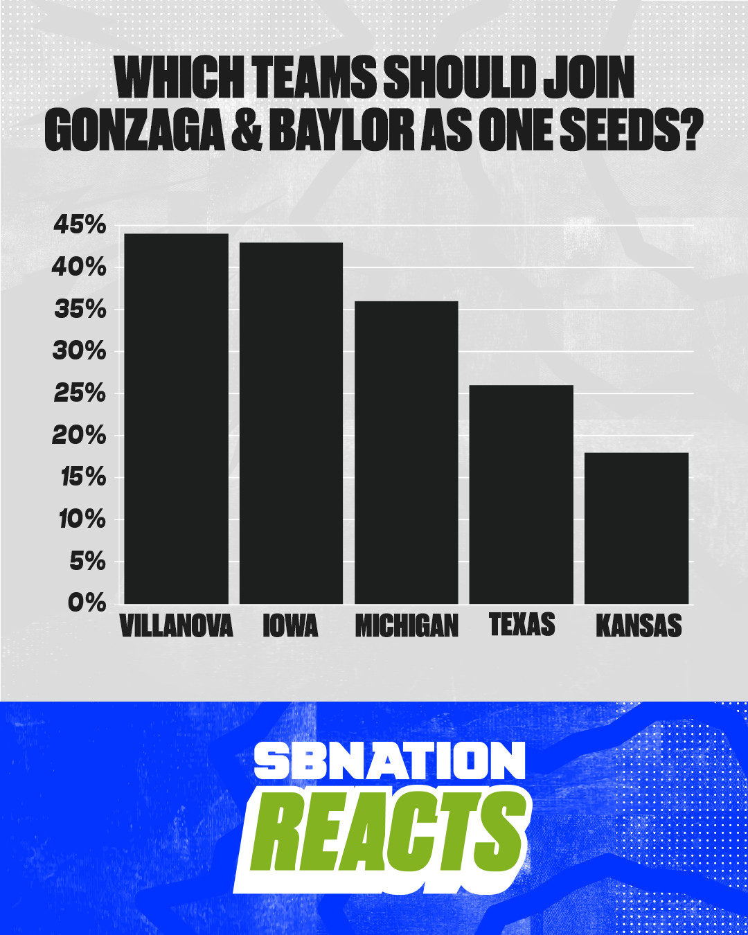 But figuring out which two teams should join them on the top lines is much harder. According to fans around the country, Villanova and Iowa are best positioned right now. The Wildcats earned 44 percent of the vote, just ahead of Iowa’s 43 percent. They were trailed by Michigan (36 percent), Texas (26 percent), Kansas (18 percent), Tennessee (14 percent), and Houston (seven percent).